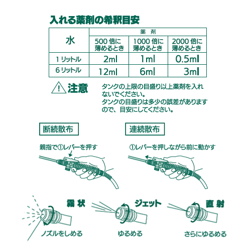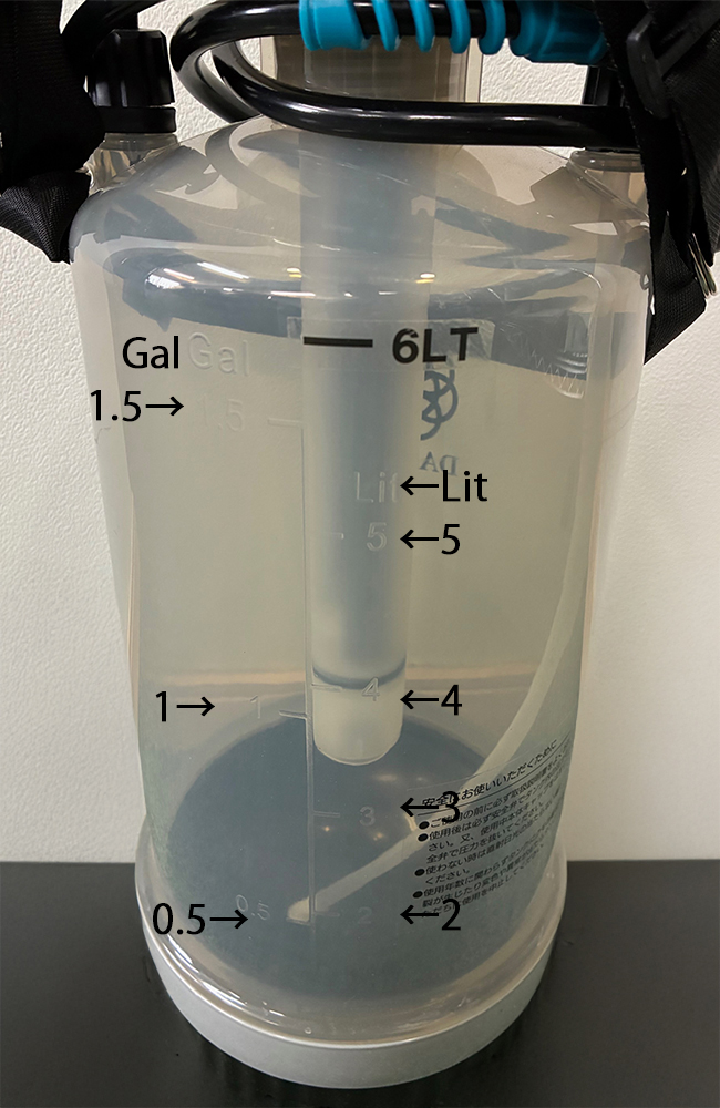 | 中身が一目でわかるクリアタンク 薬剤の残量が一目でわかります。また、目盛があるため薬剤の希釈作業が容易です。 |