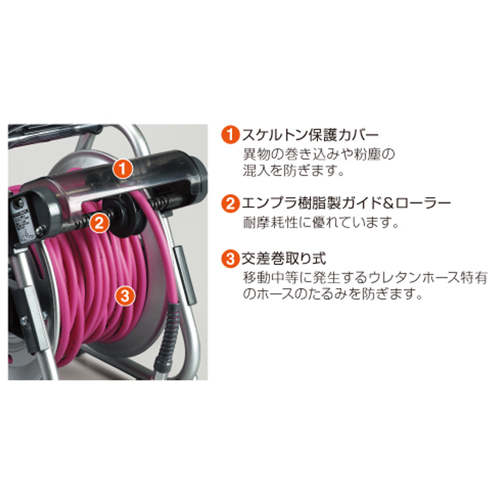 | 交差巻き取り式でホースのたるみを防ぎます。 | |||
