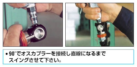 | 安全ロックをスライドさせニップルを約70゜回転して脱位置に戻すと残圧を放出し、鞭打ち現象を防ぎます | |||