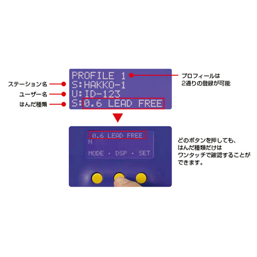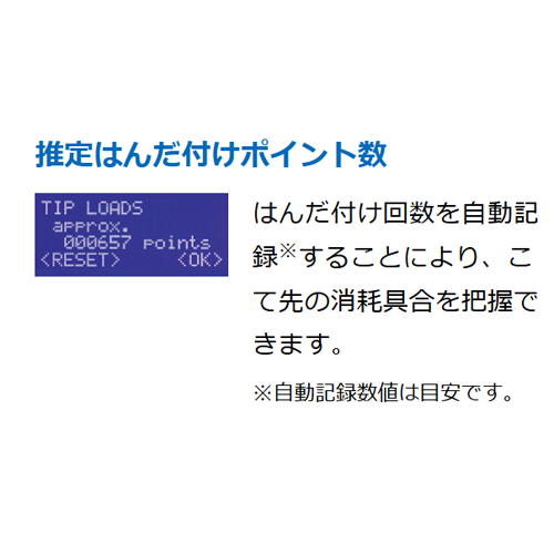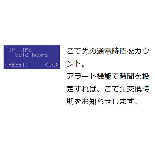 | 「こて先通電時間」や「推定半田付けポイント数」などの情報を記録で、こて先交換目安などに使えます。 | |||