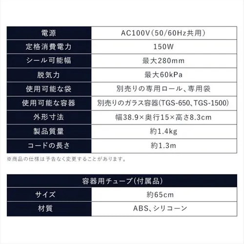 | 脱気力 | 最大60kPa | サイズ | 389(W)×150(D)×83(H)mm |