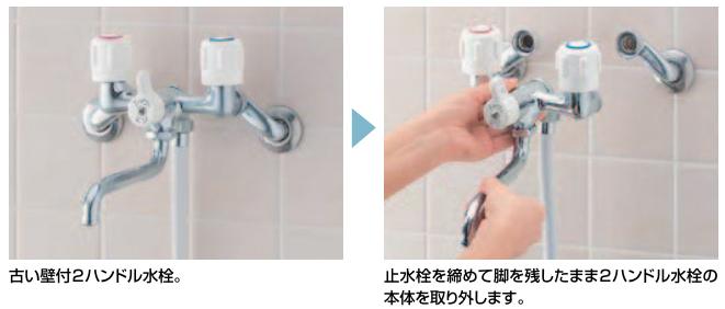 | MYM製の壁付2ハンドル混合水栓取付脚に、LIXILのサーモスタット付き混合水栓を取り付ける為のアダプター | |||