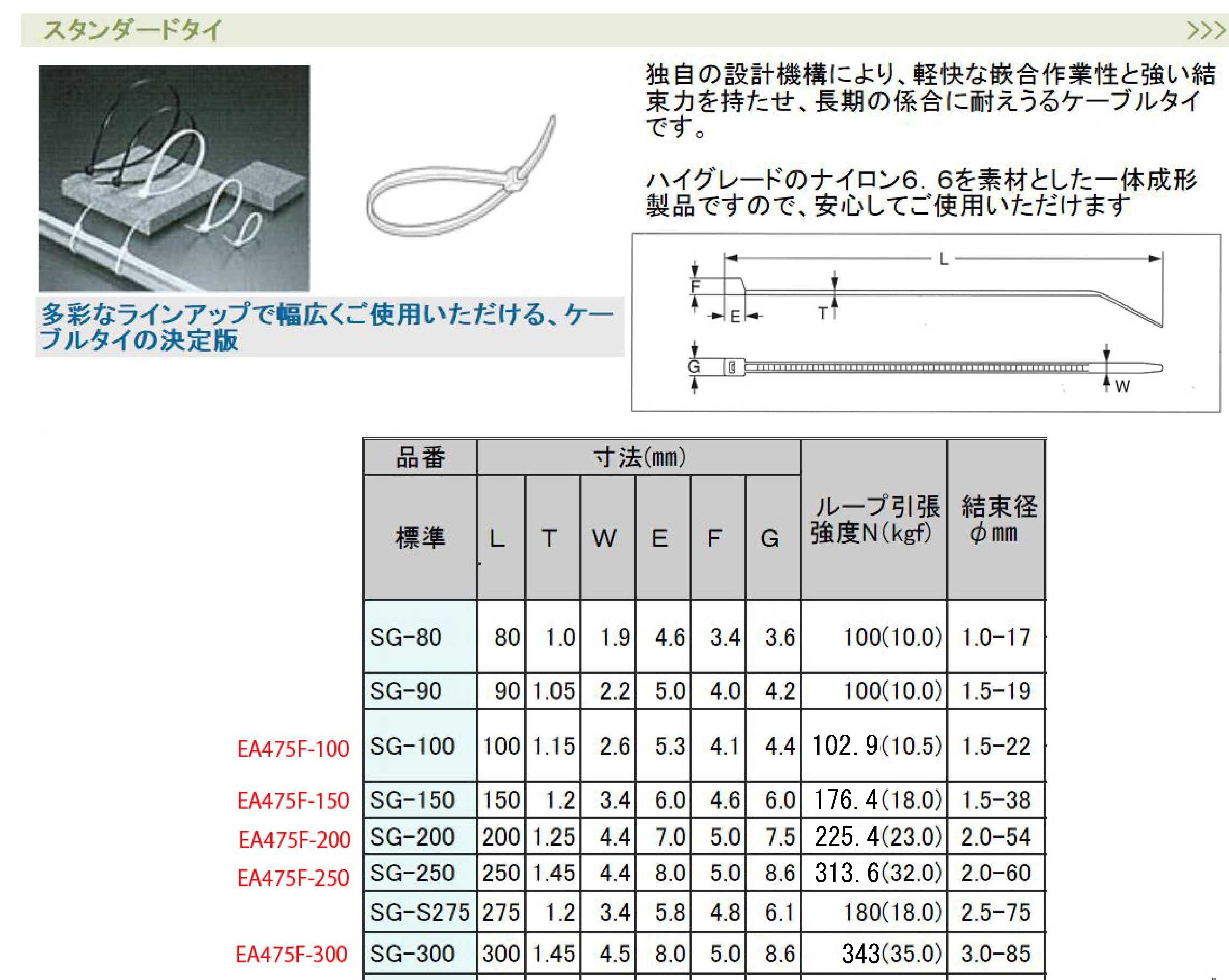 | 軽快な嵌合作業性と強い結束力を持たせ、長期の係合に耐えうるケーブルタイです。 | |||
