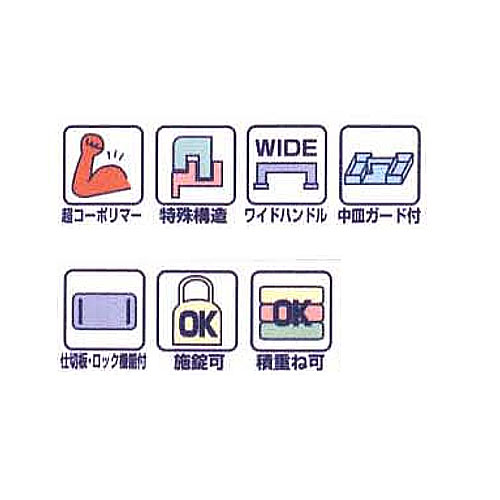 | 材質 | 超高耐衝撃性コポリマー ハンドル、サイド中皿、サイド中皿バックル:ABS バックル:ポリカーボネート |