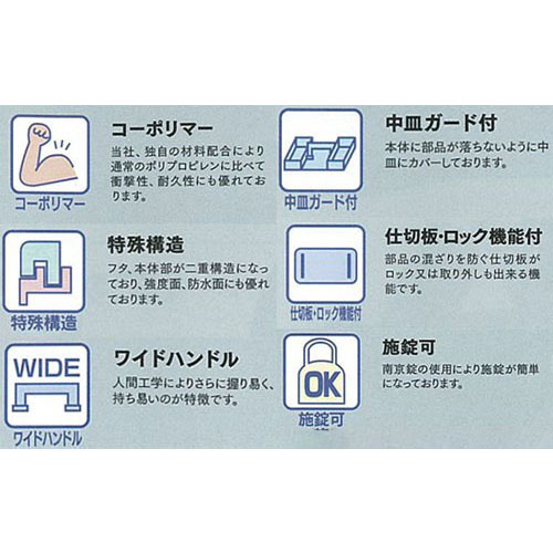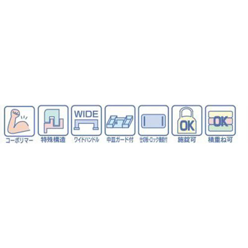 | 中皿高さ | 53mm | 材質 | 高耐衝撃性コポリマー樹脂 ハンドル、バックル:ABS |