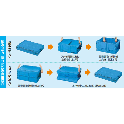 | 再生材を50%使用した環境にやさしいフタ一体型折りたたみ式コンテナです。 | |||