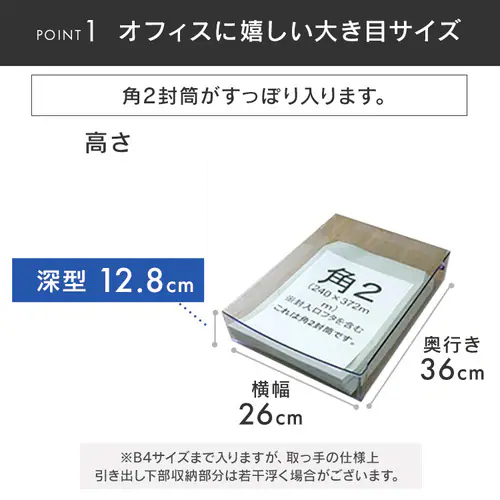 引出し内寸 | 260(W)×360(D)×128(H)mm | 引出し耐荷重 | 2kg/1段あたり |