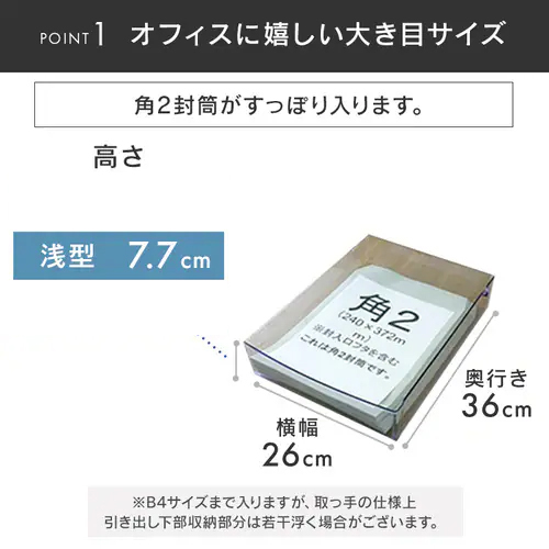 引出し内寸 | 260(W)×360(D)×77(H)mm | 引出し耐荷重 | 2kg/1段あたり |