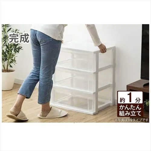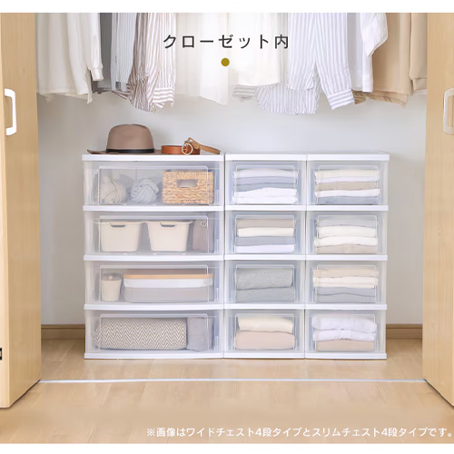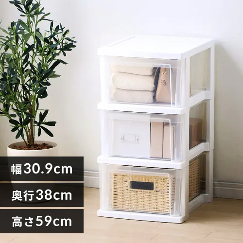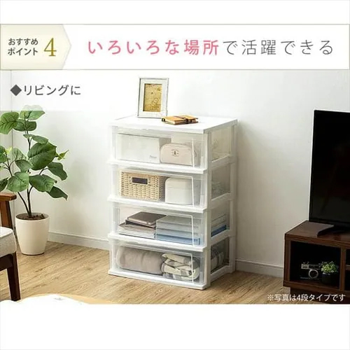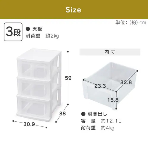 | 収納の目安 | Tシャツなら8枚、バスタオルなら2枚(引出1段あたり) | カラー | ホワイト/クリア |