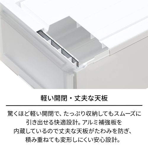 | 天板のたわみを防ぐアルミ補強板を内蔵。積み重ねた下段も変形しにくい高品質な頑丈設計です。 | |||