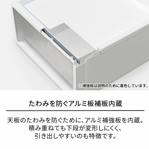 | 天板前部にアルミ補強板内蔵で積み重ねても下段が変形しにくく、引き出しやすいのも特徴です。 | |||