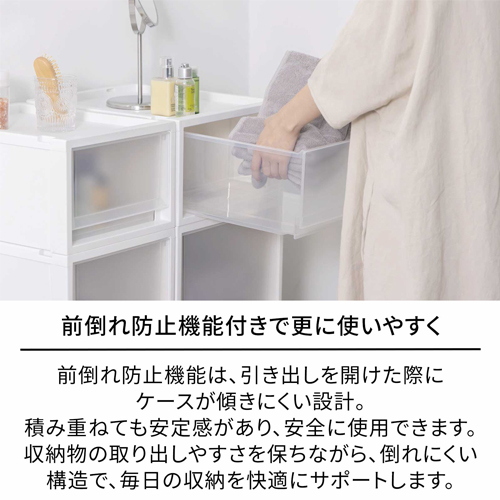 | 積み重ねた状態で引出しを引いた時に、ケース後部が浮き上がり前方へ倒れてしまうことを防ぎます。(前倒れ防止機能) | |||