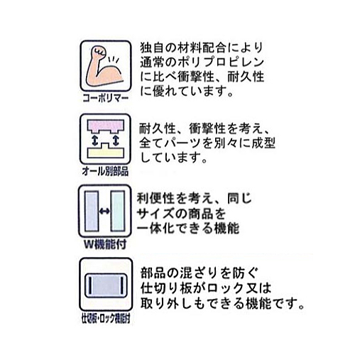 | 固定仕切板 | 4枚 | 材質 | 耐衝撃性コーポリマー |