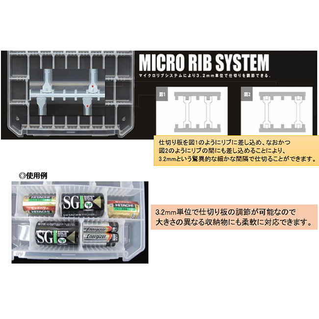| 仕切板をリブと、リブの間に差し込めることにより、3.2mmという驚異的な細かい間隔で仕切ることが可能です。 | |||