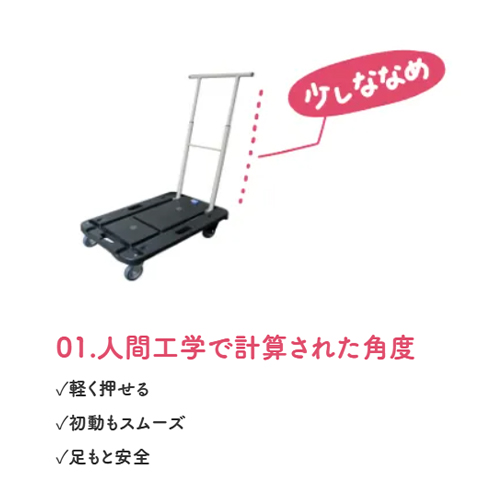| ハンドルは人間工学で計算された少しななめの角度で、軽く押せます。 | |||