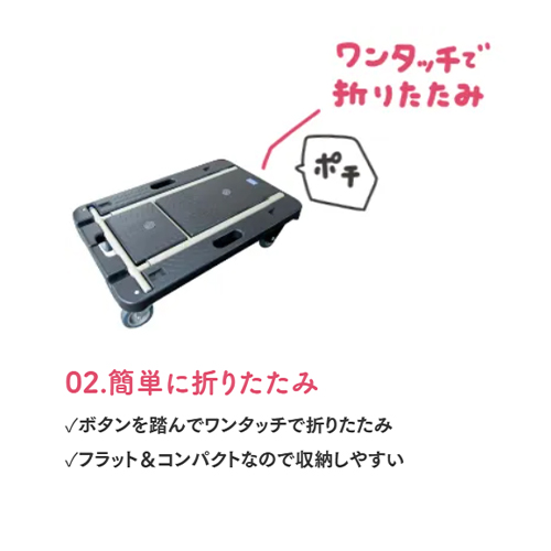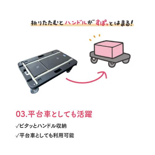 | 荷台にハンドルがすぽっとはまり、フラットでコンパクトに収納可能。 ドーリーとしても使用できます。 |