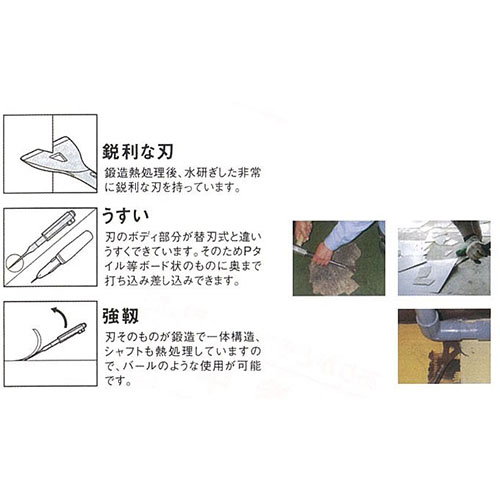 | 刃のボディ部分がうすくできているので、Pタイル等ボード状のものに奥まで打ち込み・差し込みできます。 | |||