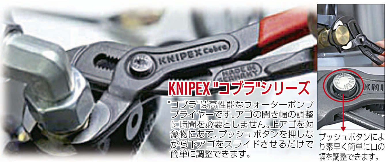 | 上のアゴを対象物にあて、プッシュボタンを押しながら、下アゴを上にスライドさせるだけで簡単に調整することができます | |||