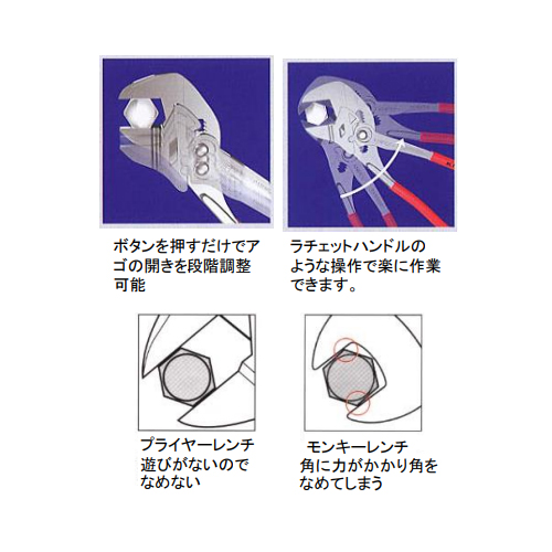 | プライヤーとレンチの二つの役割を果たし、つかむ、締める、曲げる作業に最適です。 | |||