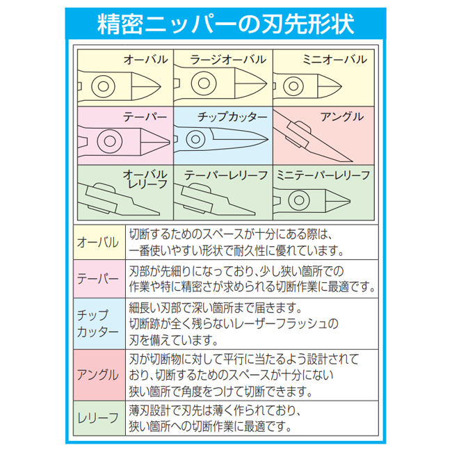 | 切断能力(銅線) | 0.2~1.5mm | 切断形状 | セミフラッシュ(多少の切断跡が残るが、刃に耐久性があります) |
