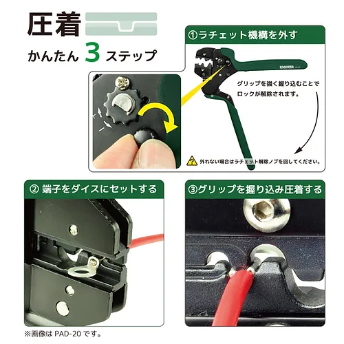 | ラチェット機能付きで圧着不良を防止します。 | |||
