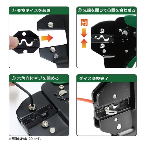 | 用途 | 絶縁端子の圧着に | 圧着範囲 | 1.25、2.0、5.5m㎡ |