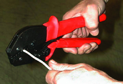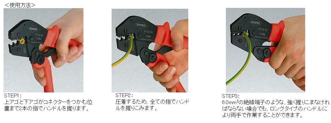 | 断面の大きい導体は両手操作で簡単に圧着できます。 | |||
