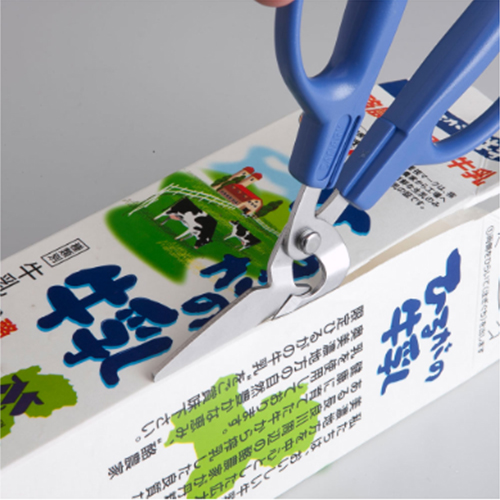 | 特殊形状の角度付ブレード 牛乳パックなどの厚紙や立体物を手に当ることなく、まっすぐ楽に切り進むことができ、 切断物がハサミの後方へスムーズにすり抜けるよう設計されています。 |