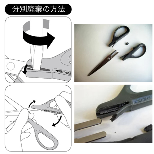| 金属とプラスチックは簡単に分解でき、分別廃棄が可能です。 ハンドルの溝にマイナスドライバーを差し込み、左図の矢印の方向に回し、ハンドルの内部の部分を折って取り除きます。 |