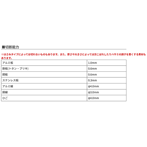 | 従来のハサミでは切れないアルミ板、ステンレスの板までも楽に切る事が可能。 (針金も、刃根元部分の「ひご切り」で簡単に切ることができます。) |