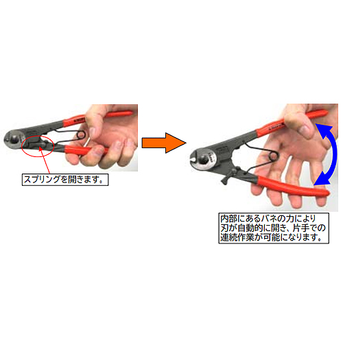 | スプリングを開くとバネの力で刃が自動的に開き、片手での連続作業が可能になります。 | |||