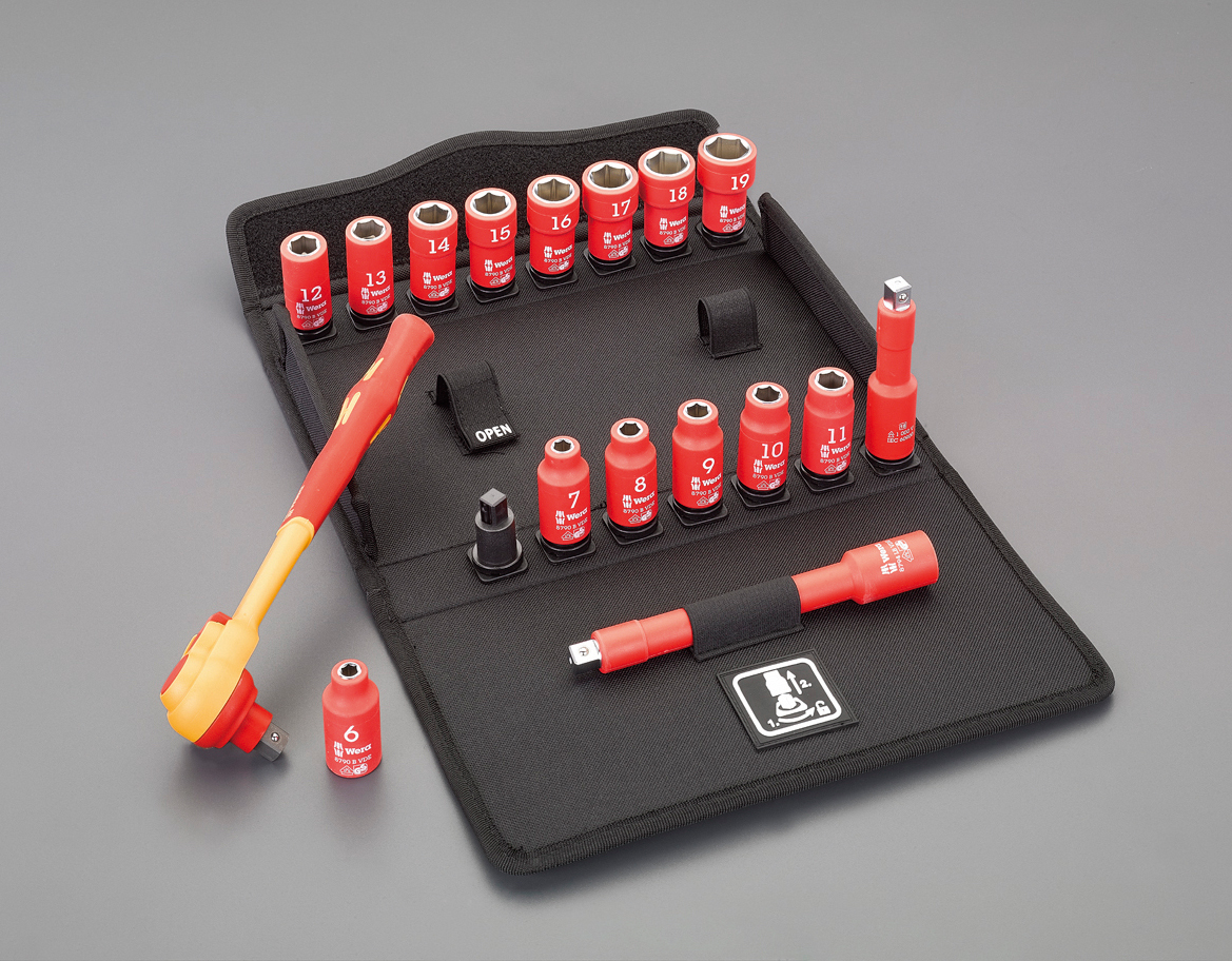 専用ポーチへコンパクトに収納できる、携帯性の高い絶縁ソケットレンチです