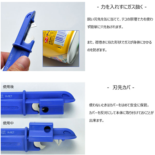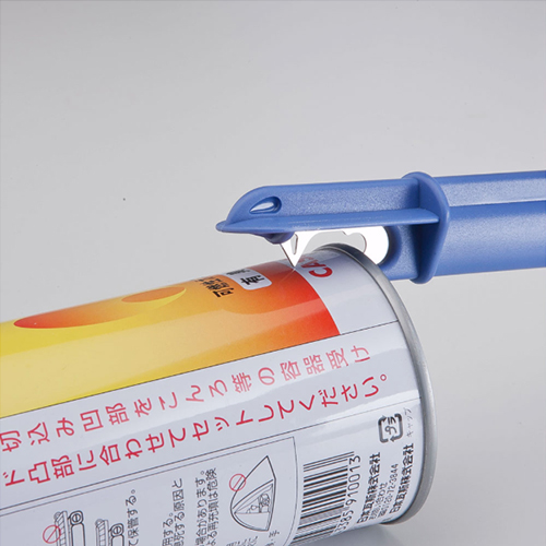 | 持ちやすいグリップと、缶に穴を開けた時の飛び散りを防ぐエリマキ状の形状で使いやすい設計。 | |||