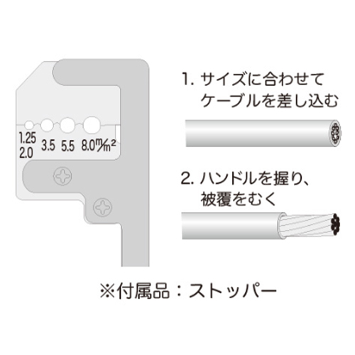 | 用途 | 電線の皮むき(エコ電線対応) | 能力(IV線) | 1.25・2.0・3.5・5.5・8.0m㎡ |