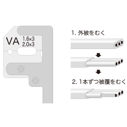 | 用途 | VVF線(VA線)の皮むきに | 能力(VA線) | 1.6mm×3心 2.0mm×3心 |