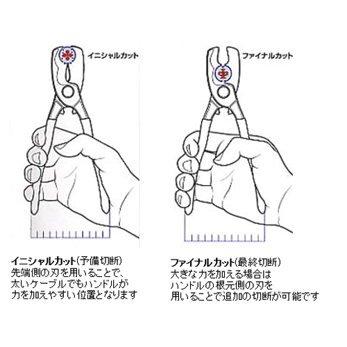 イニシャルカット(先端側の刃を用いる予備切断)とファイナルカット(根元側の刃を用いる最終切断)を順に行うことで、直径20mmまでのケーブルを切断することができます。 | |||