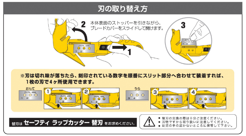 | 刃は切れ味が落ちたら、刻印されている数字を順番にスリット部分へ合わせて装着すれば、1枚の刃で4ヶ所使用できます。 | |||