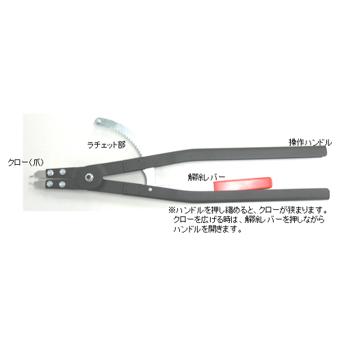 | ※ハンドルを押し縮めると、クローが狭まります。 クローを広げる時は、解除レバーを押しながらハンドルを開きます。 |
