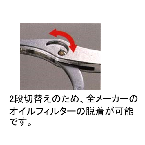 | 2段切替えのため、全メーカーのオイルフィルターの脱着が可能です。 | |||