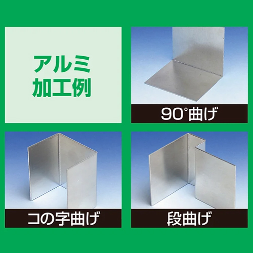 | 重量 | 256g(1ペア) | 曲げ能力 | (アルミ板A5052):厚み1.5mm以下、幅30mm以下 (純アルミ板A1000系):厚み1.5mm以下、幅50mm以下 (銅板・真鍮板):厚み1.0mm以下、幅50mm以下 (アルミ棒):φ3mm以下 (銅・真鍮棒):φ2mm以下 |