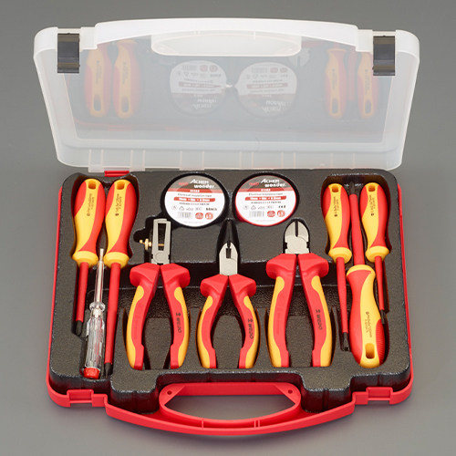 | <セット内容> | 11点セット ●170mmワイヤーストリッパー ●170mmニッパー ●170mmラジオペンチ ●(-)ドライバー:0.4×2.5、0.8×4、1×5.5 ●(+)ドライバー:#1、#2 ●140mm電圧テスター ●黒絶縁テープ ●赤絶縁テープ |