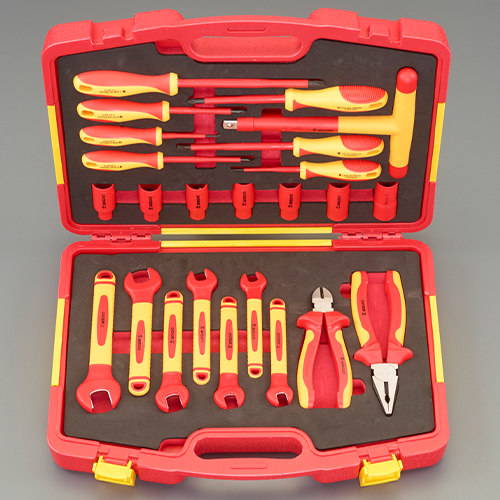 | <セット内容> | 24点セット ●(1/2”)ソケット:10、11、12、13、14、17、19mm ●片口スパナ:10、11、12、13、14、17、19mm ●200mm(1/2”)T型ハンドル ●200mmペンチ ●160mmニッパー ●(-)ドライバー:0.4×2.5、0.8×4、1.0×5.5、1.2×6.5 ●(+)ドライバー:♯0、♯1、♯2 |