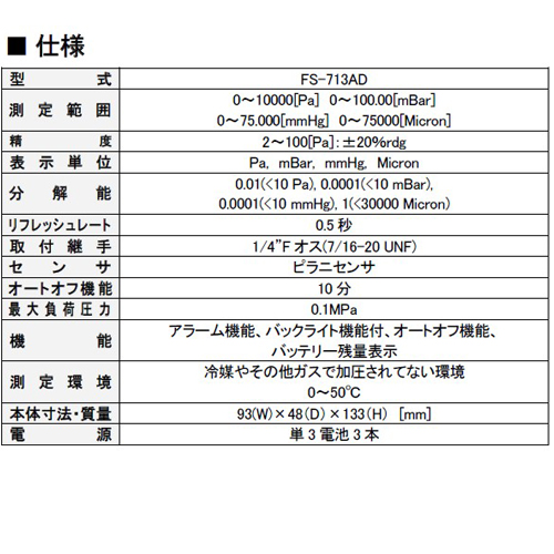 | 表示単位 | Pa、mBar、mmHg、Micron | 計測方式 | ピラニセンサ方式 |
