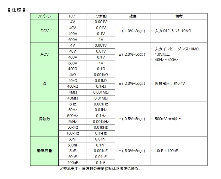 | 静電容量 | ●レンジ 50nF/500nF/5μF/50μF/100μF ●分解能 0.01nF/0.1nF/0.001μF/0.01μF/0.1μF ●確度 ±(5.0%rdg+5dgt) |