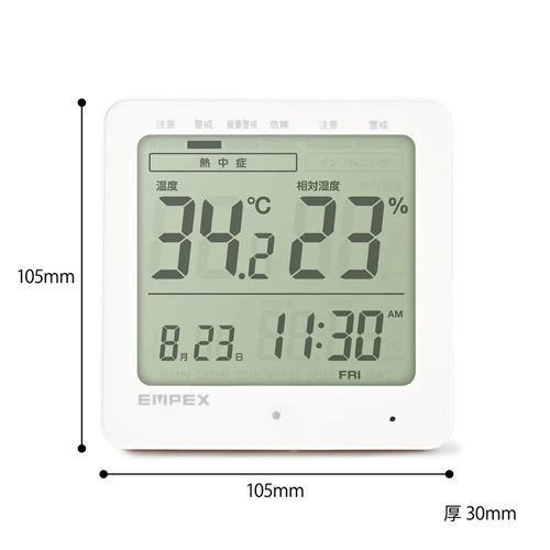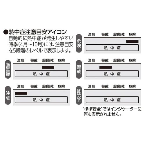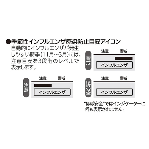 | 機能 | 熱中症注意目安アイコン表示(注意、警戒、厳重警戒、危険の4つ)、 季節性インフルエンザ感染防止目安アイコン(注意、警戒の2つ)、 熱中症アラーム(ピピピ音と赤色LED)、時刻、日付 |