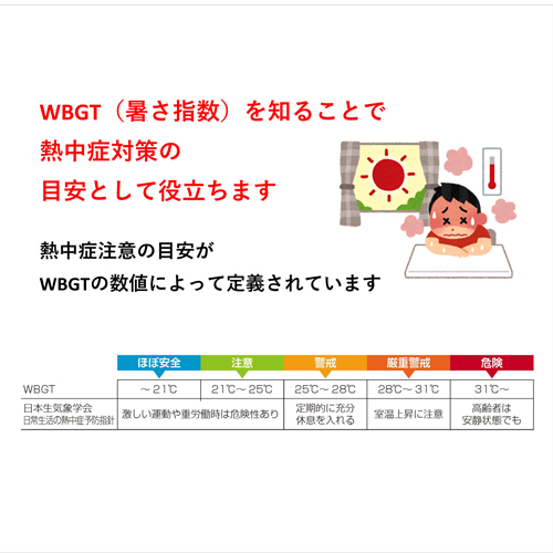 | 測定項目 | 熱中症指数(WBGT)、温度、相対湿度、絶対湿度 | 測定範囲 | 温度:-9.9~49.9℃ 湿度:20~95%RH(相対湿度) |