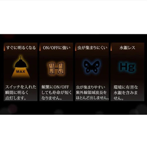| ★LED電球の特長★ ・水銀レス:環境に有害な水銀を含みません。 ・すぐに明るく:スイッチを入れた瞬間に明るく点灯します。 ・虫が集まりにくい:虫が集まりやすい紫外線領域波長をほとんど出さず、灯具清掃の手間を軽減できます。 ・ON/OFFに強い:スイッチを頻繁にON/OFFしても劣化せず、寿命が短くなりません。 ・低UV/低赤外線:紫外線や赤外線をほとんど出さないので、紫外線による色あせや赤外線による熱が気になりません。 |