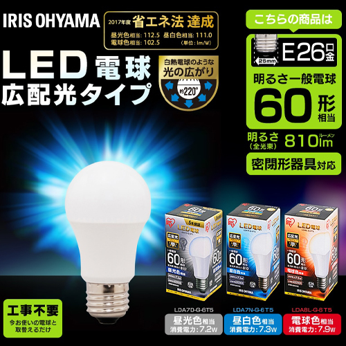 | 白熱電球のように広範囲に明るい広配光タイプなので、リビング・ダイニング・キッチン・脱衣所などの照明に最適なLED電球です。 | |||