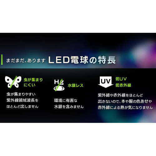 | 虫が集まりにくい 虫が集まりやすい紫外線領域波長をほとんど出さないので灯具清掃の手間を軽減できます。 |
