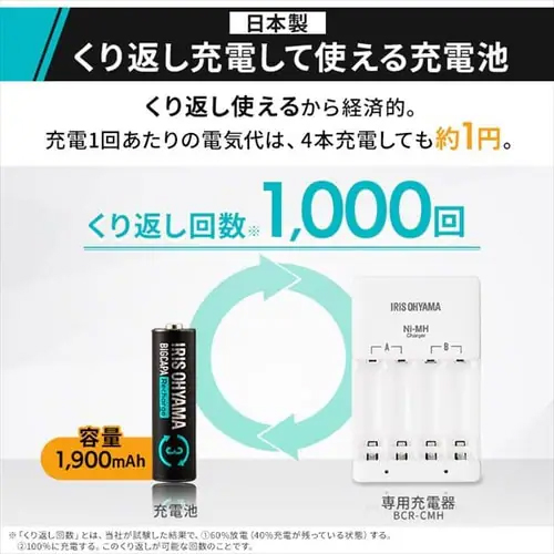 | 充電1回あたりの電気代は、4本充電しても約1円。 | |||